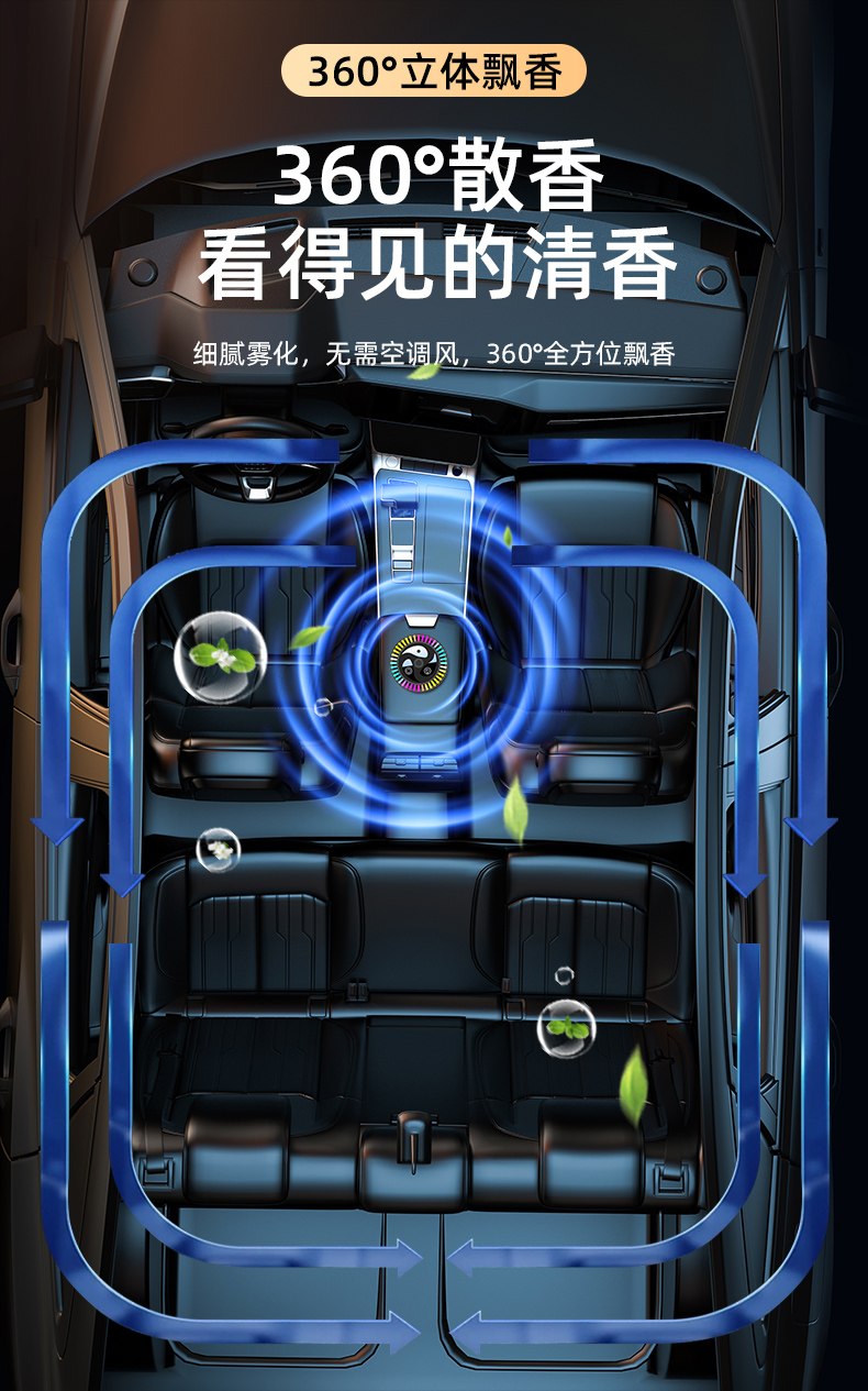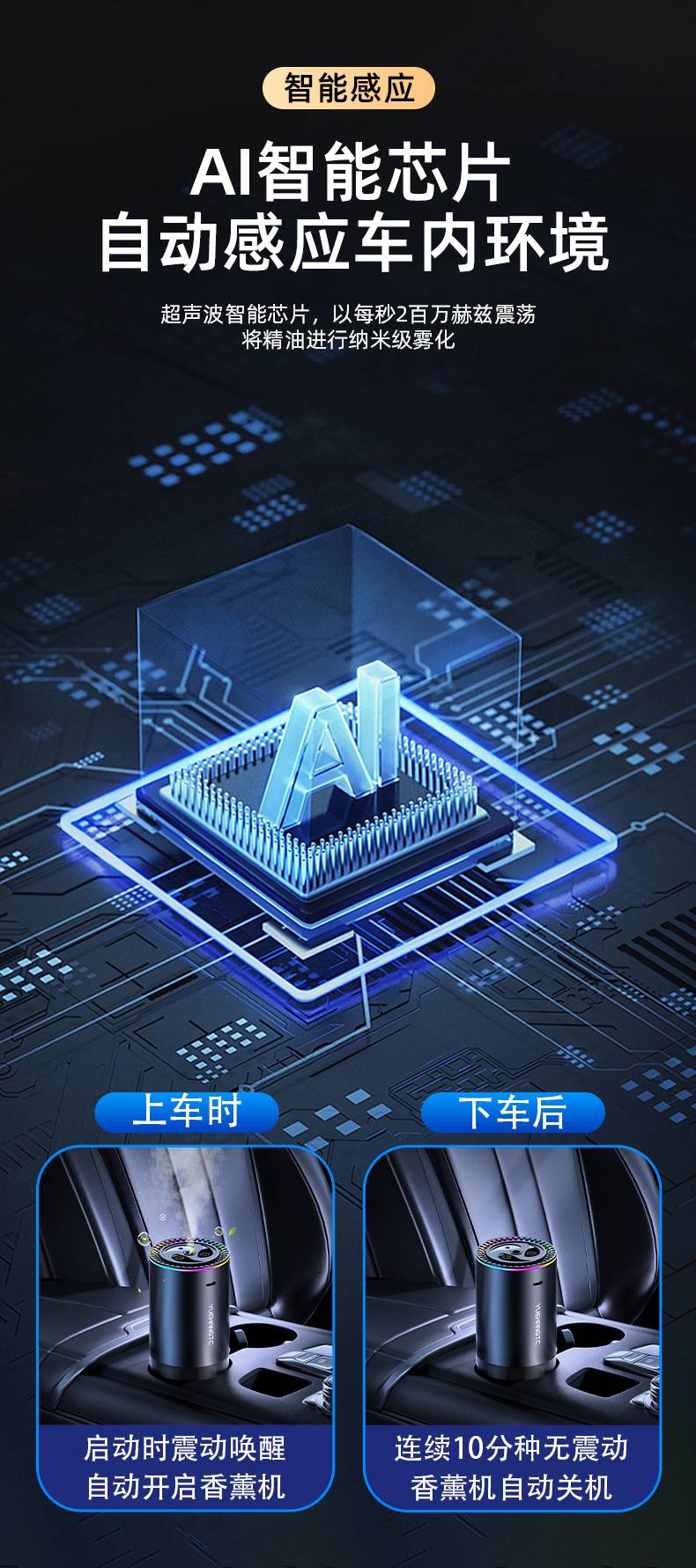 7. Το έξυπνο τσιπ AI ανίχνευσης ανιχνεύει αυτόματα το έξυπνο τσιπ υπερήχων στο περιβάλλον του αυτοκινήτου και ψεκάζει τα αιθέρια έλαια σε νανοκλίμακα με δόνηση 2 εκατομμυρίων hertz ανά δευτερόλεπτο